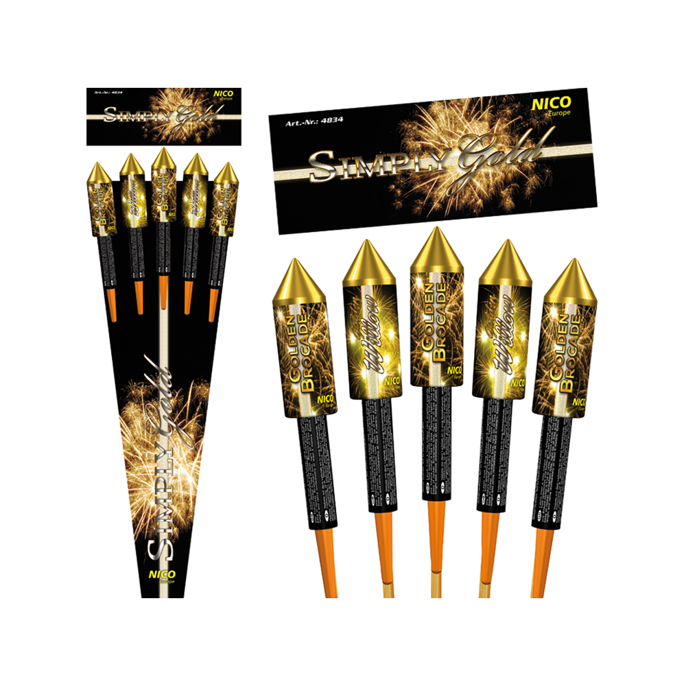 Das Simply Gold 5er-Rak.-Btl. ist ein exklusives Raketensortiment, das in zwei Varianten sortiert ist und mit ausgewählten Gold-Effekten begeistert. Jede Rakete steigt hoch in den Himmel und entfaltet sich zu einem prächtigen Gold-Effekt, der mit einer lautstarken Zerlegung ein beeindruckendes Spektakel bietet.